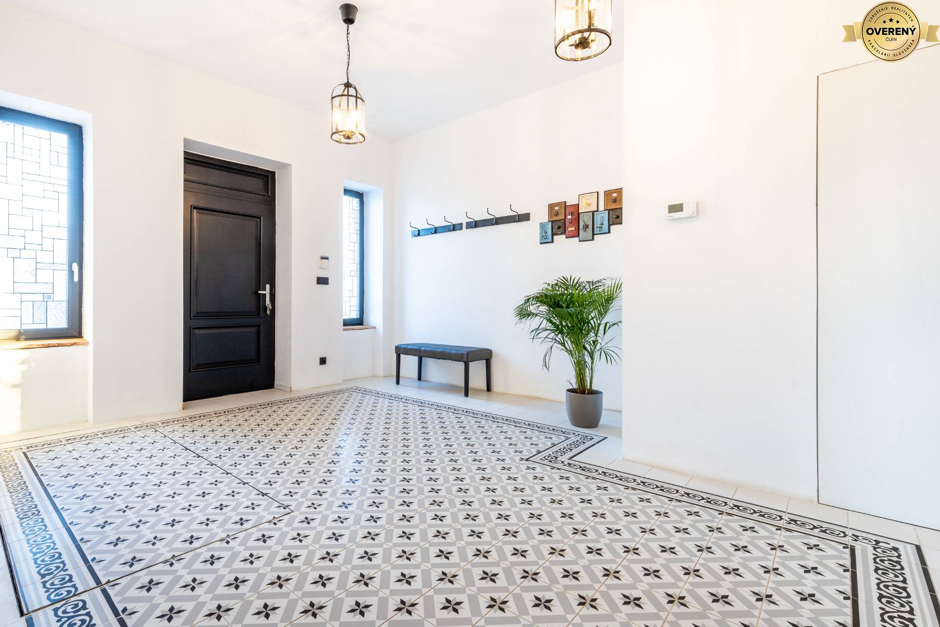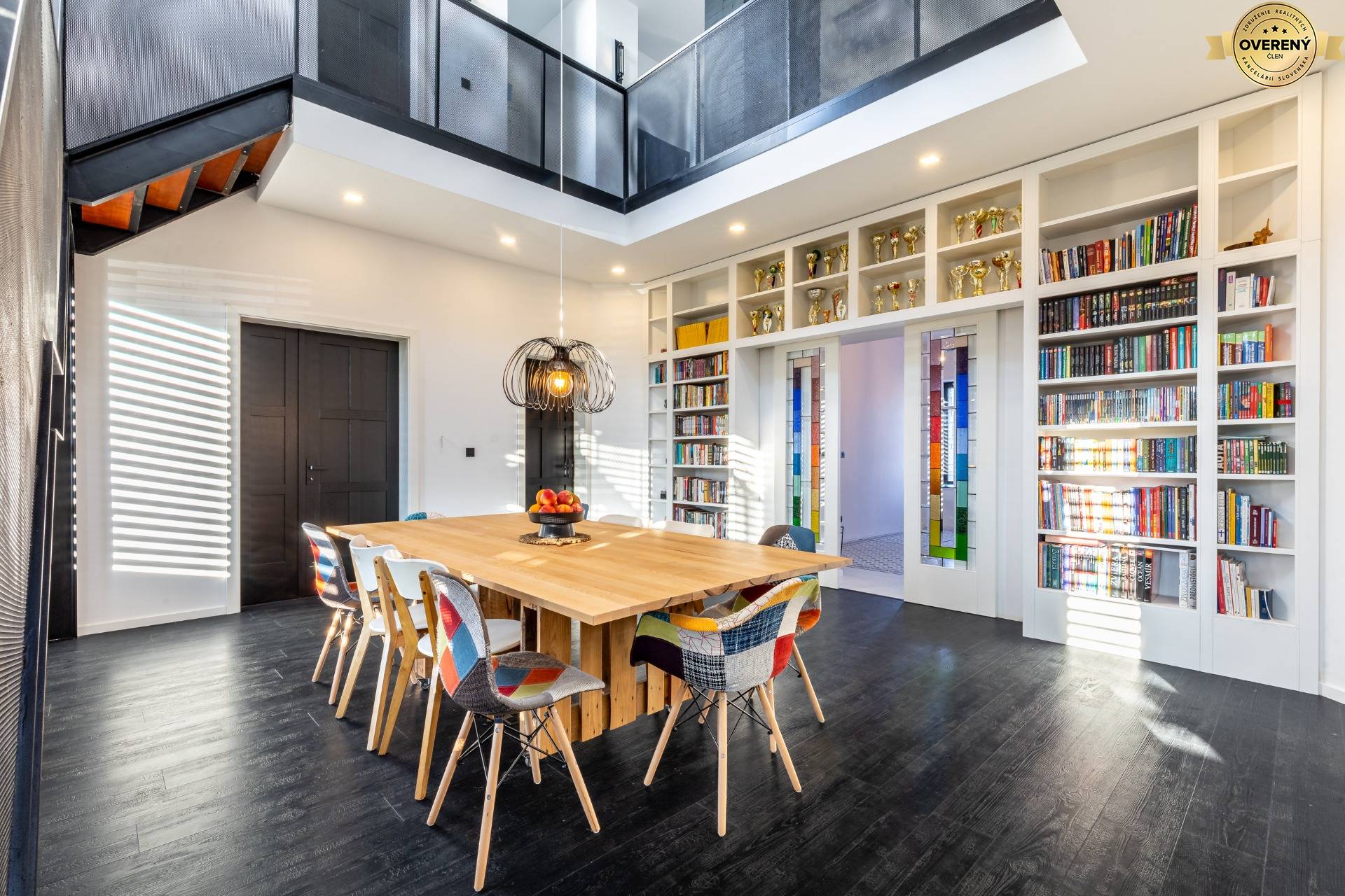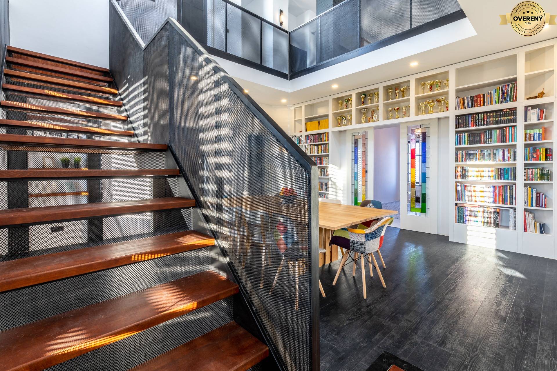 Originálny vstup do domu je riešený na mieru vyrobenými, bezpečnostnými, kazetovými, drevenými dverami, po stranách sú na mieru vyrobené vitrážové okná. Všetky interiérové dvere sú vyrábané na mieru, drevené spoločne s drevenými zárubňami. Jedinečnosť interiéru a jeho dominantnosť podčiarkujú krásne na mieru vytvorené, vitrážové, drevené, posuvné dvere do haly, ktoré sú súčasťou veľkolepej knižnice vyrobenej na mieru.