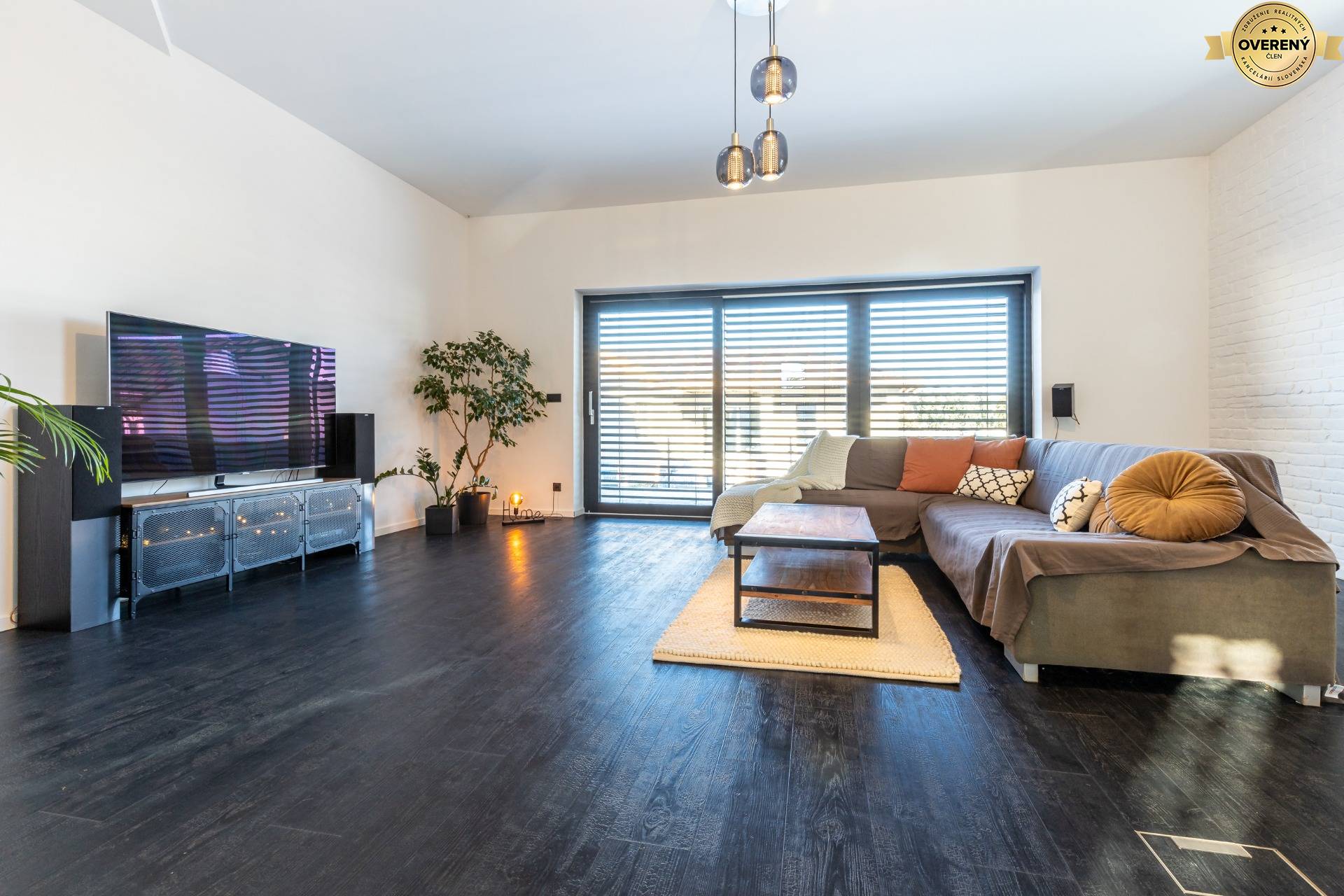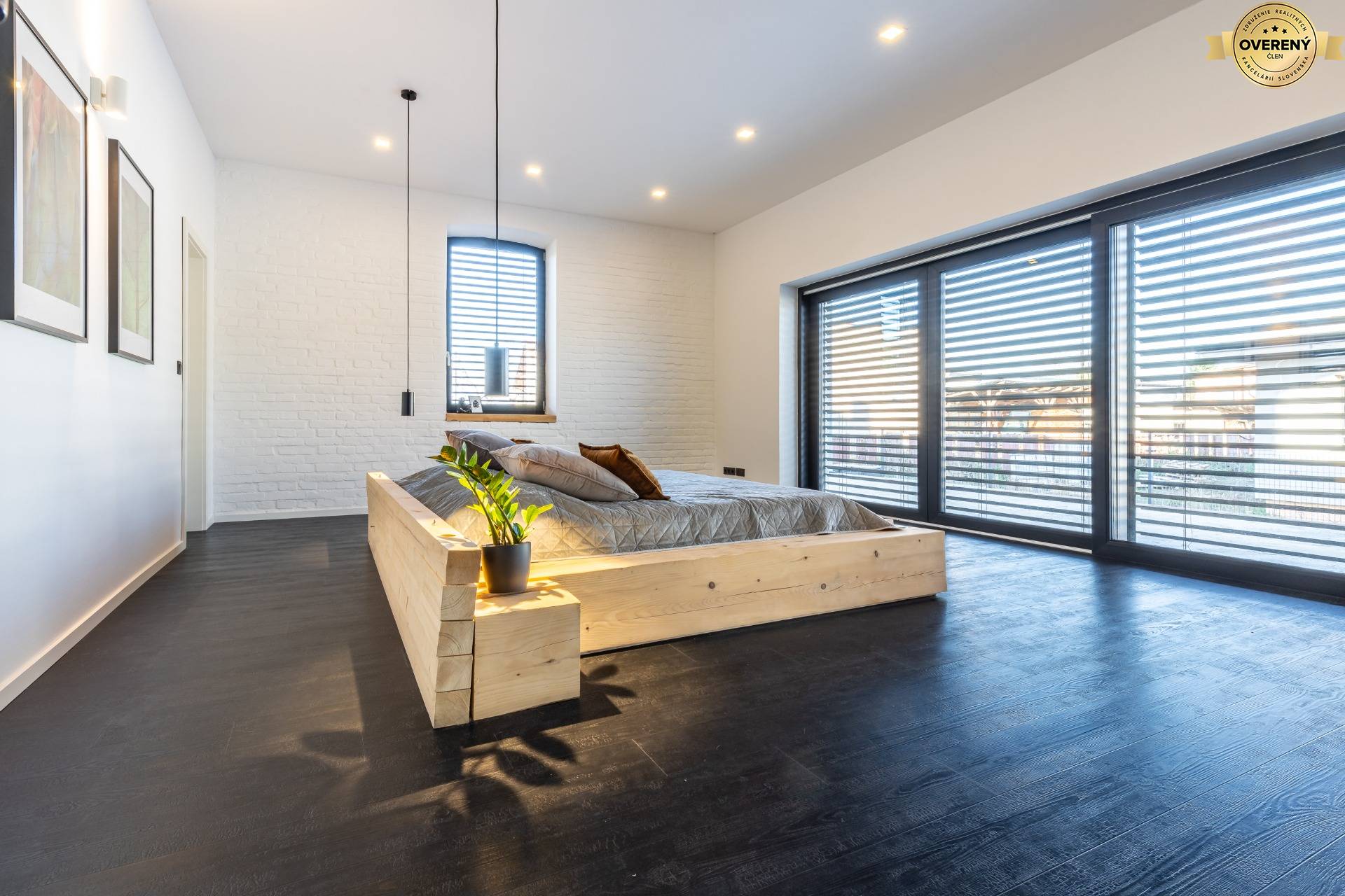 Interiér a exteriér domu dopĺňajú veľké francúzske okná, izolačné, trojkomorové na prízemí (HST portál) a poschodí v otvorenej galérií (posuvno-výklopné). Všetky strešné okná na prvom poschodí sú zn.Velux, zabezpečené roletami a ostatné okná na objekte sú taktiež izolačné, trojkomorové, plastové okná zn. Oknoplast Pixel. Tienenie je zabezpečené exteriérovými, hliníkovými, falcovanými, lamelovými žalúziami, ktoré je možné ovládať cez centrálnu inteligenciu Loxone, cez aplikáciu v mobile, alebo cez internet.