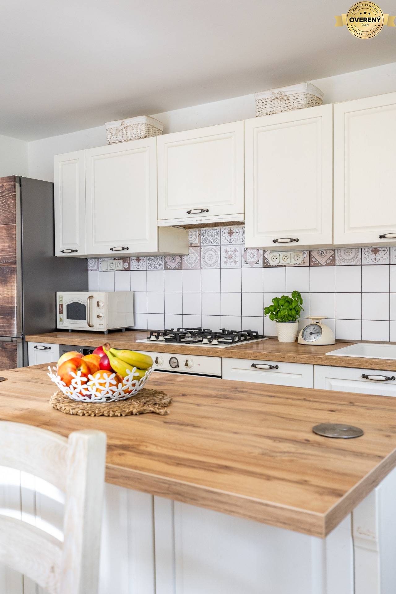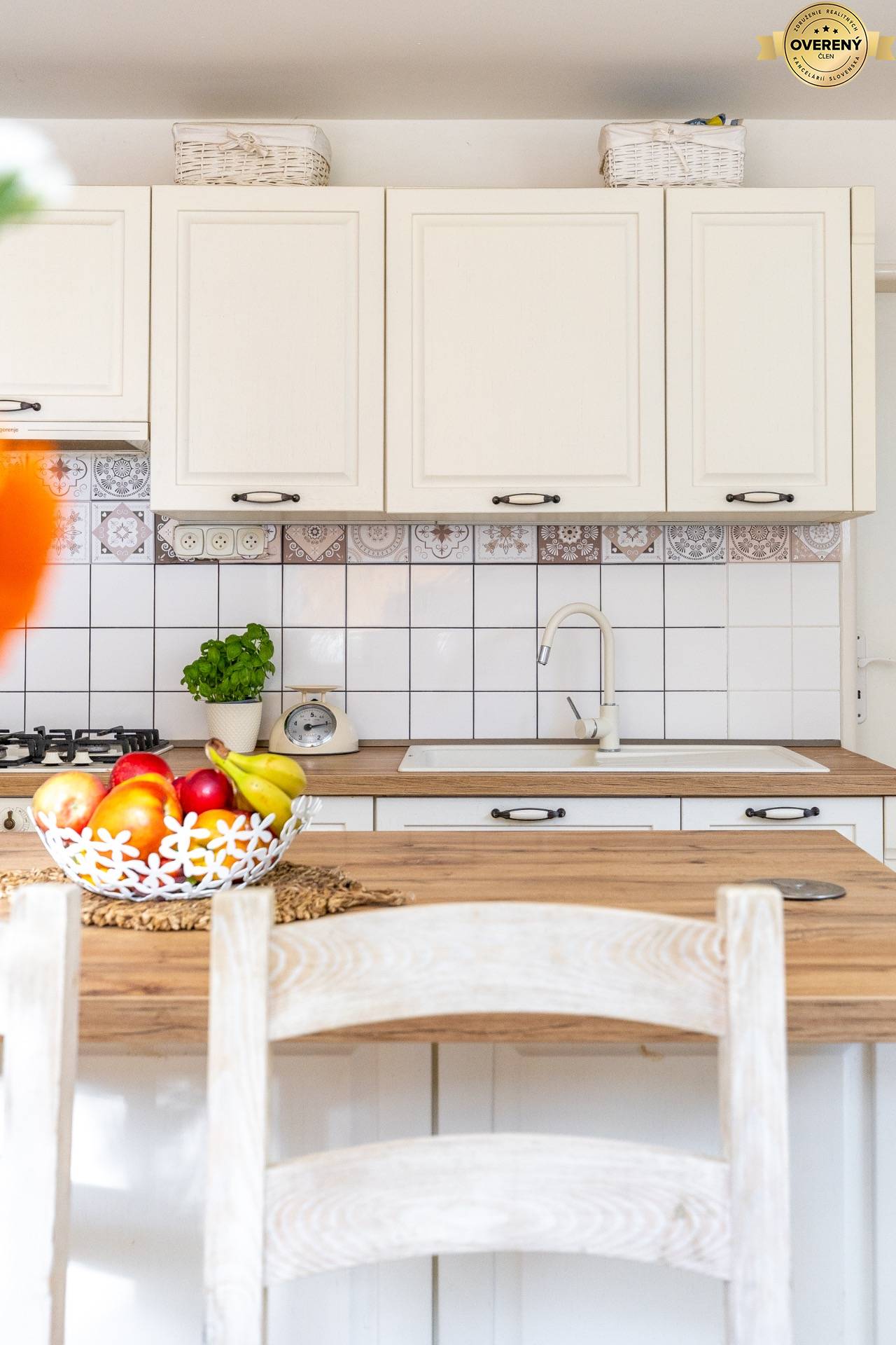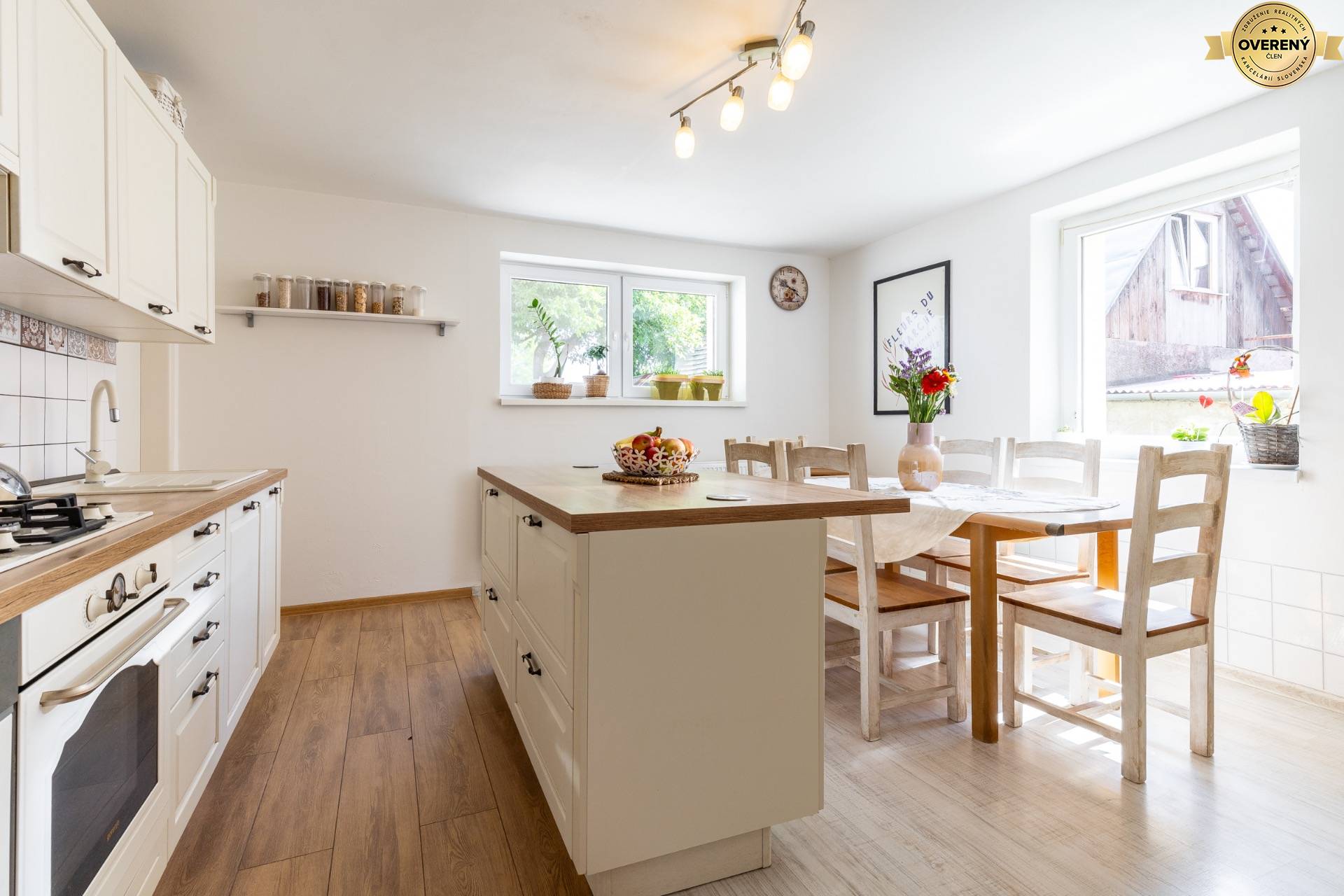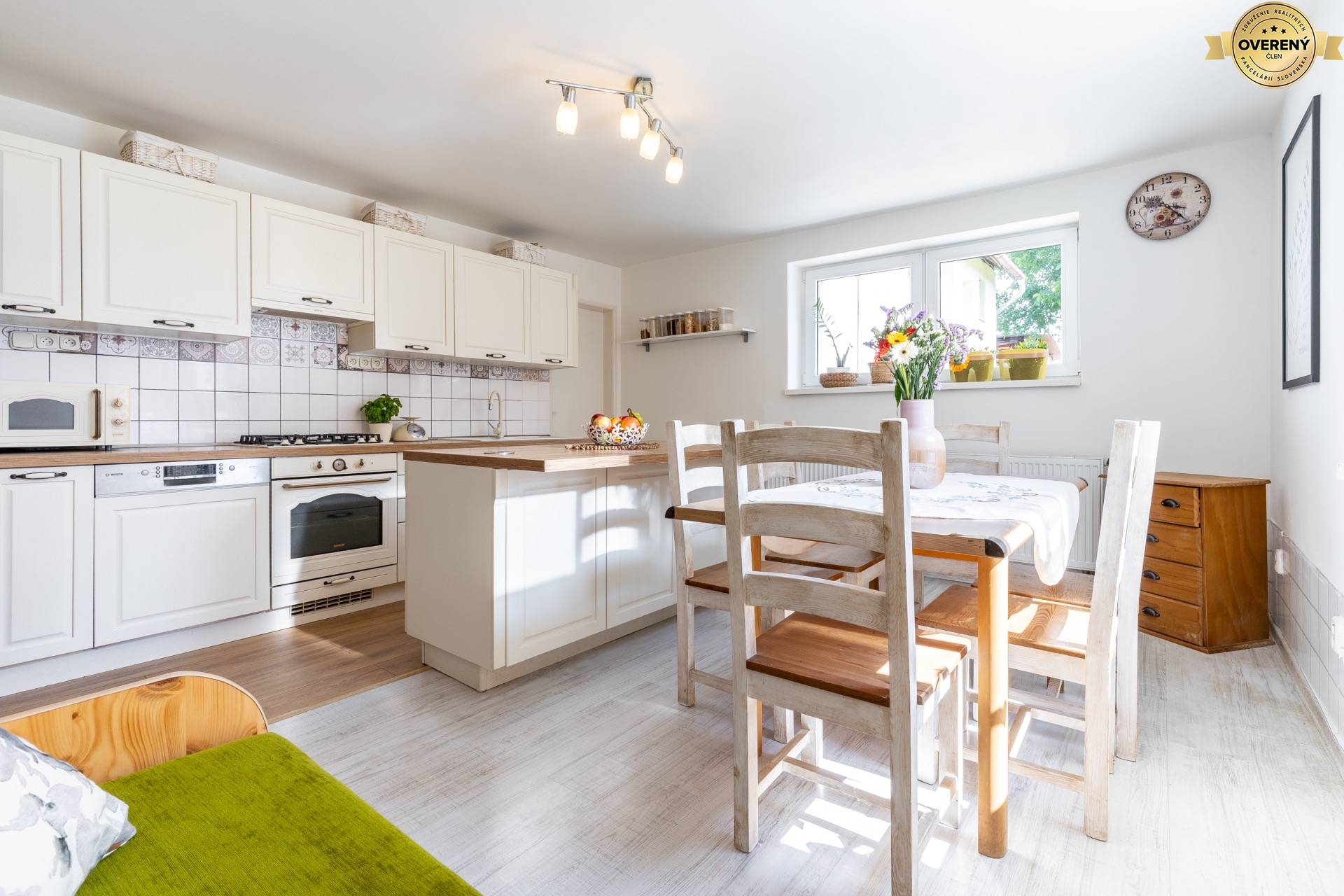 Veľkorysá kuchyňa v štýle provence so vstavanými spotrebičmi, kuchynským ostrovom, jedálenským stolom pre 6 ľudí, linkou, vstavanou plynovou varnou doskou. Súčasťou kuchyne je aj komora, kde máte dostatočný priestor od potravin až po kuchynské doplnky, ktoré sú prehľadne uložené.