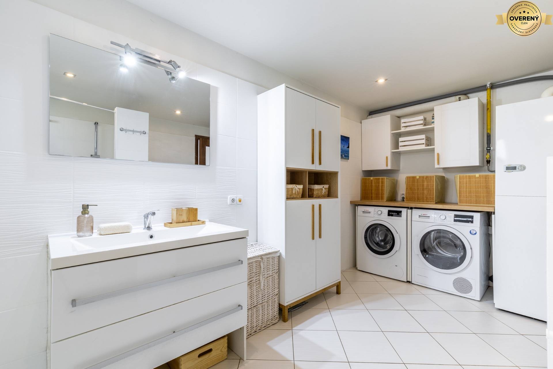 Zároveň sa tu nachádza priestranná kúpeľňa s veľkým sprchovacím kútom, umývadlom so skrinkou, s podomietkovým WC a súčasťou je aj priestor na prádlo, práčku, sušičku a policová zostava s odkladacím priestorom.