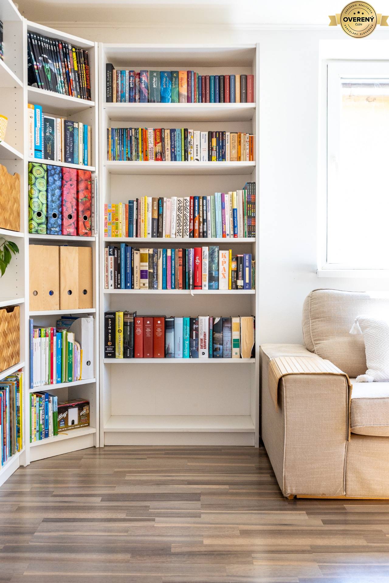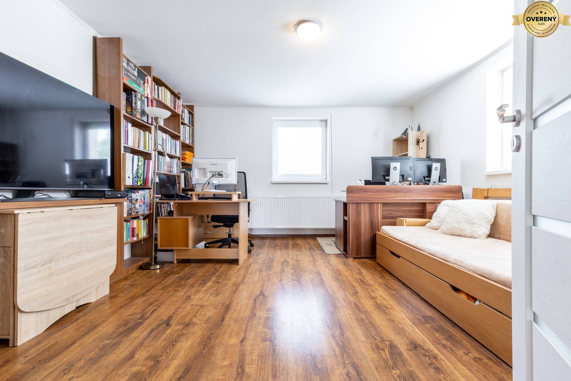 Tretia izba na poschodí je pracovňa, knižnica aj oddychová zóna v jednom. Táto izba ponúka ideálny priestor na prácu z domu, štúdium alebo pokojný relax. Dve veľké pracovné stanice, priestranná knižnica a pohodlné sedenie vytvárajú funkčný a zároveň útulný priestor, kde si každý nájde svoje miesto. Vďaka dvom oknám je miestnosť dostatočne presvetlená prirodzeným svetlom, čo pozitívne vplýva na koncentráciu aj celkovú pohodu. Využitie tejto izby je flexibilné – môže slúžiť ako domáca kancelária, hosťovská izba alebo pokojný kútik na čítanie.