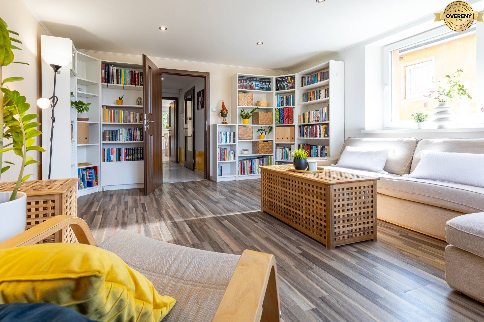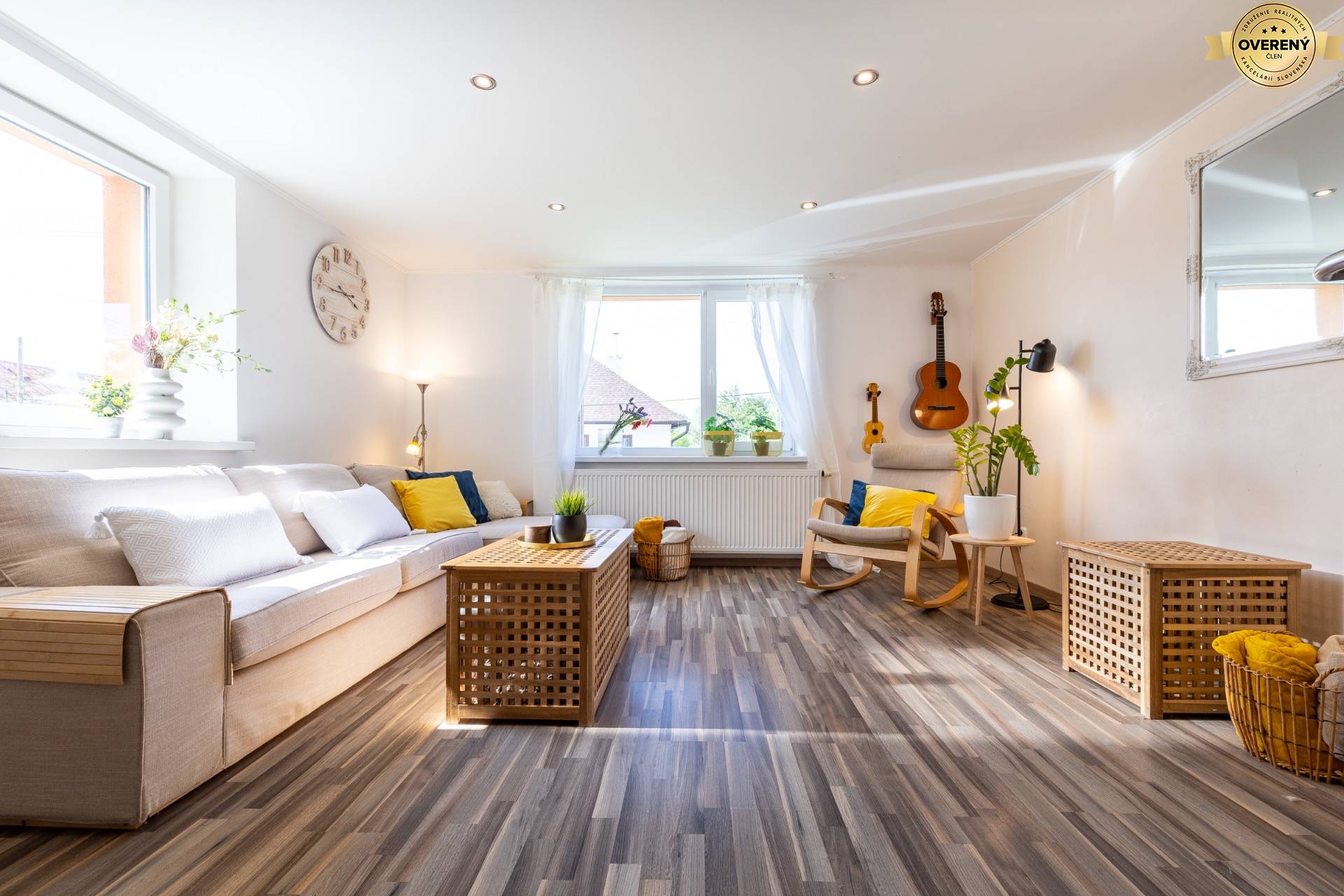 Obývacia izba v tomto dome vás privíta príjemnou atmosférou s množstvom prirodzeného svetla, ktoré príjemne presvetľuje celý priestor. Vďaka premyslenej dispozícii tu pohodlne umiestnite priestrannú rohovú sedačku, čítací kútik či ďalší nábytok podľa vašich potrieb.Svetlé steny, drevená podlaha a doplnky v prírodných tónoch vytvárajú harmonické a útulné prostredie, ktoré si zamilujete po prvom vstupe. Miestnosť zároveň pôsobí vzdušne a otvorene – ideálna na rodinné stretnutia, oddych po práci či večery s priateľmi.