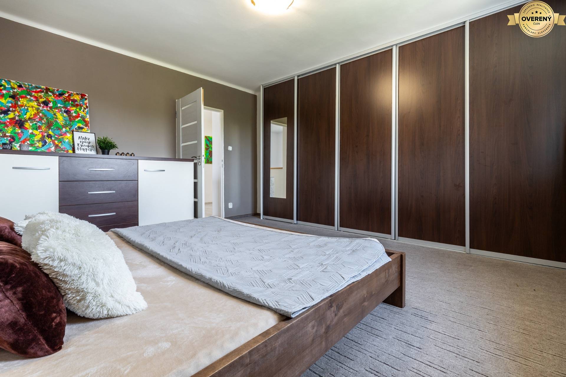 Ďalšou izbou je priestranná spálňa, ktorá je miestom pre pokojný oddych a súkromie. Dominantou je pohodlná, nadštandardná na mieru spravená manželská posteľ (200x200cm) a kvalitná vstavaná skriňa s veľkým úložným priestorom, ktorá elegantne splynie so stenou a zároveň poskytne praktické riešenie pre každodenné fungovanie.