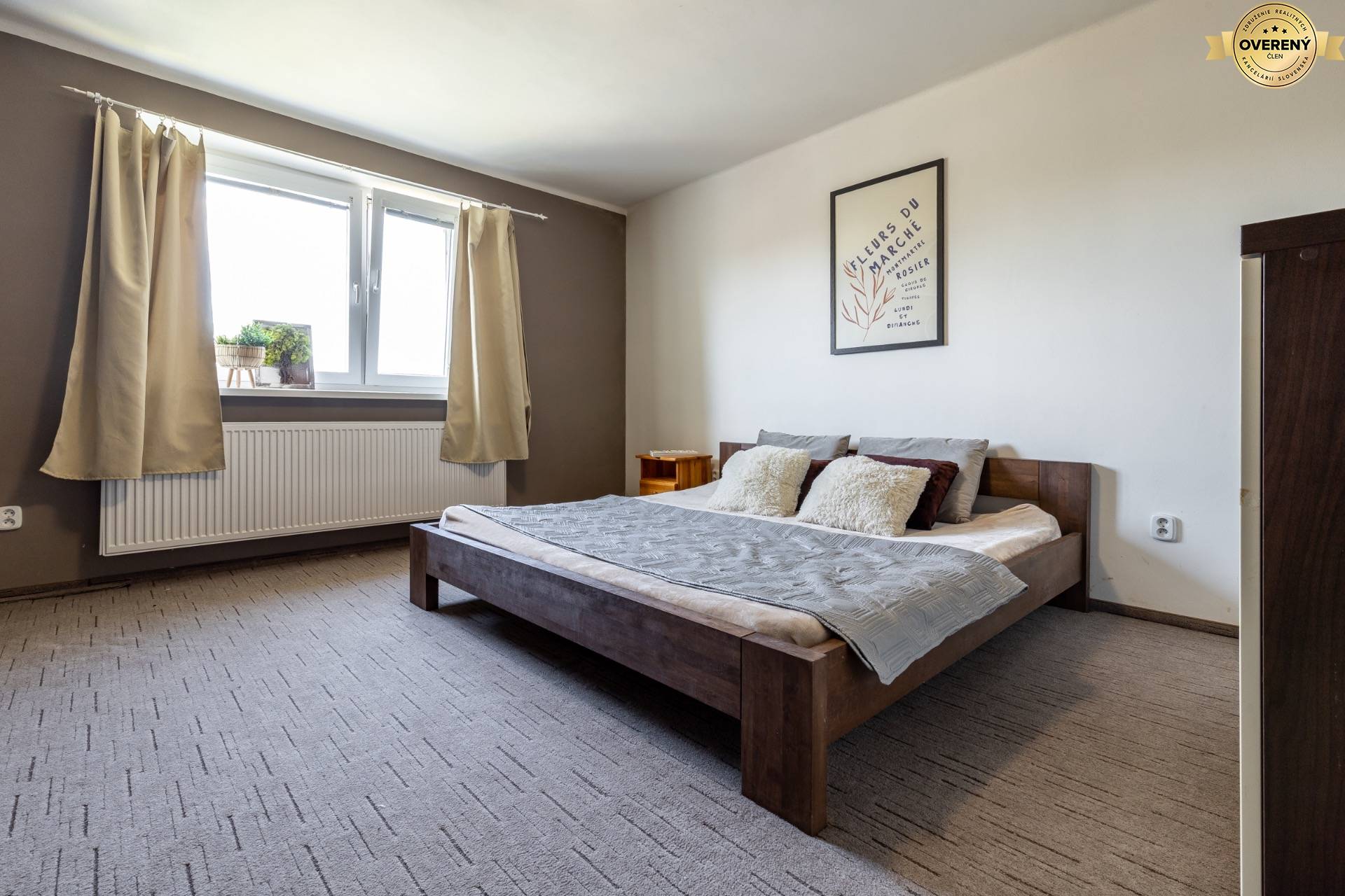 Neutrálne farby a príjemné denné svetlo z veľkého okna vytvárajú harmonickú atmosféru, ideálnu na relax aj pokojný spánok. Miestnosť je zariadená jednoducho, ale premyslene – poskytuje dostatok priestoru a zároveň pôsobí útulne.