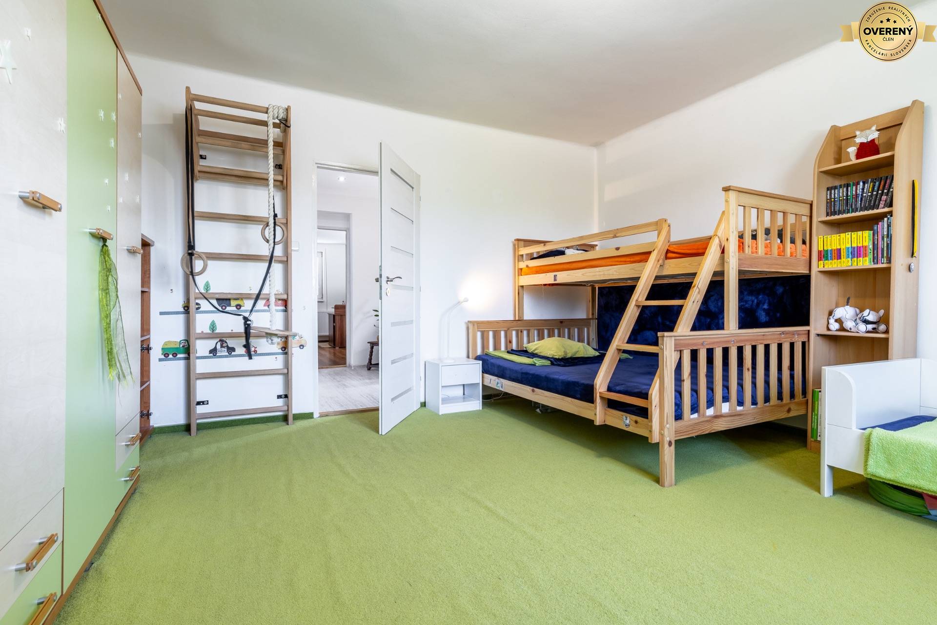 Rohová izba je ako stvorená pre vaše deti – svojou veľkorysou rozlohou ponúka dostatok priestoru na spánok, učenie aj hranie. Aktuálne zariadená ako detská izba s poschodovou posteľou, hracím kútikom a písacím stolom, ponúka však flexibilitu na prispôsobenie podľa veku a potrieb dieťaťa. Svieže farby, mäkký koberec a jednoduchý nábytok vytvárajú príjemné, bezpečné a inšpiratívne prostredie pre každodenný život najmladších členov rodiny.
